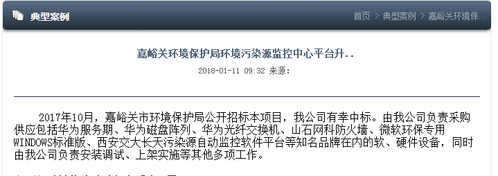2017年10月,嘉峪關(guān)是環(huán)境保護(hù)局公開(kāi)招標(biāo)本項(xiàng)目,我公司有幸中標(biāo)。由我公司負(fù)責(zé)采購(gòu)供應(yīng)包括華為服務(wù)器、華為磁盤(pán)陣列、華為光纖交換機(jī)、山石網(wǎng)科防火墻、微軟環(huán)保專用WINDOWS標(biāo)準(zhǔn)版、西安交大長(zhǎng)天污染源自動(dòng)監(jiān)獄軟件平臺(tái)等知名品牌在內(nèi)的軟、硬件設(shè)備,同時(shí)由我公司負(fù)責(zé)安裝調(diào)試、上架實(shí)施等其他多項(xiàng)工作。